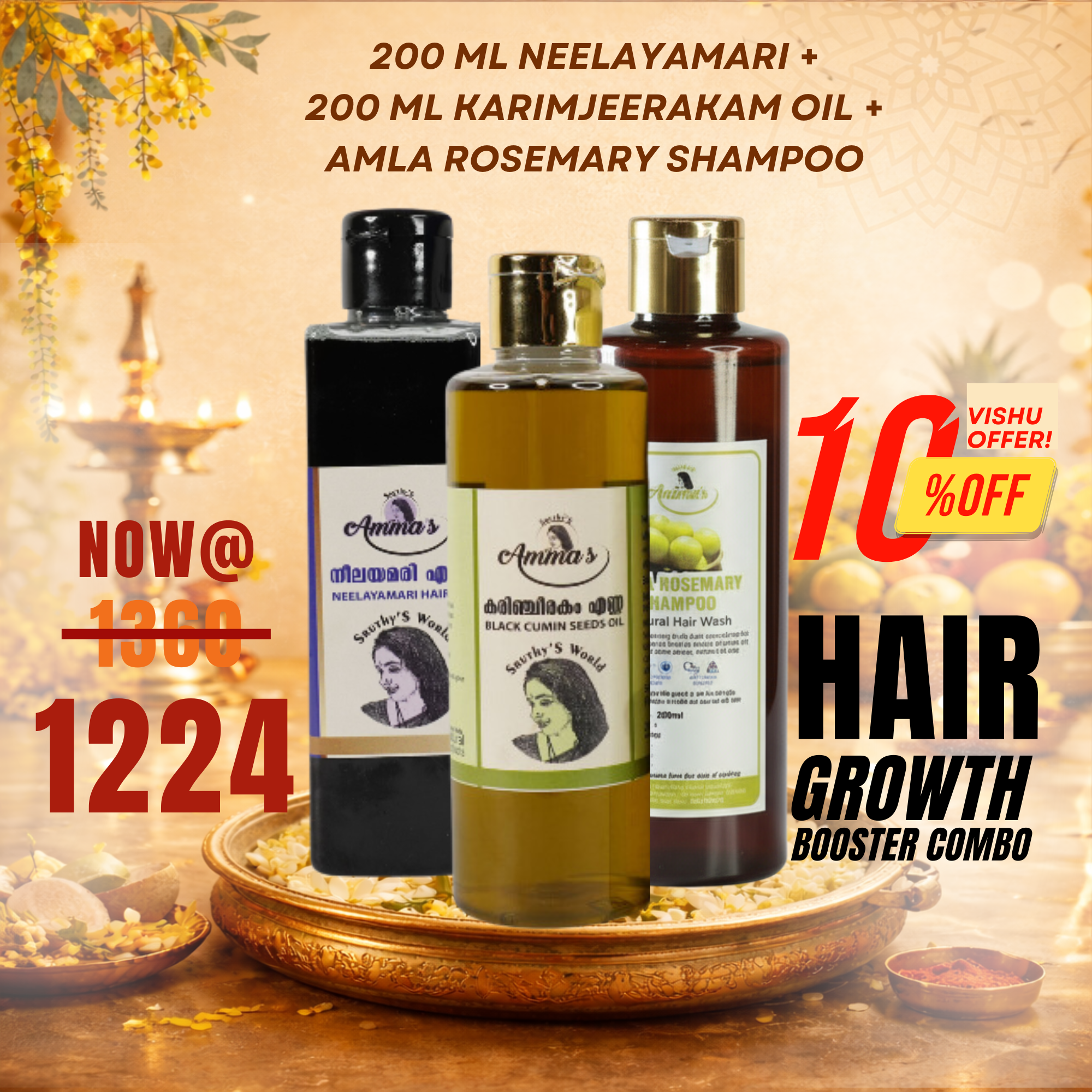 Strengthen your hair naturally with our Hair Growth Combo 2, featuring Neelayamari and Karimjeerakam oils. This powerful Ayurvedic duo nourishes the scalp, reduces hair fall, and promotes thicker, healthier hair growth.
