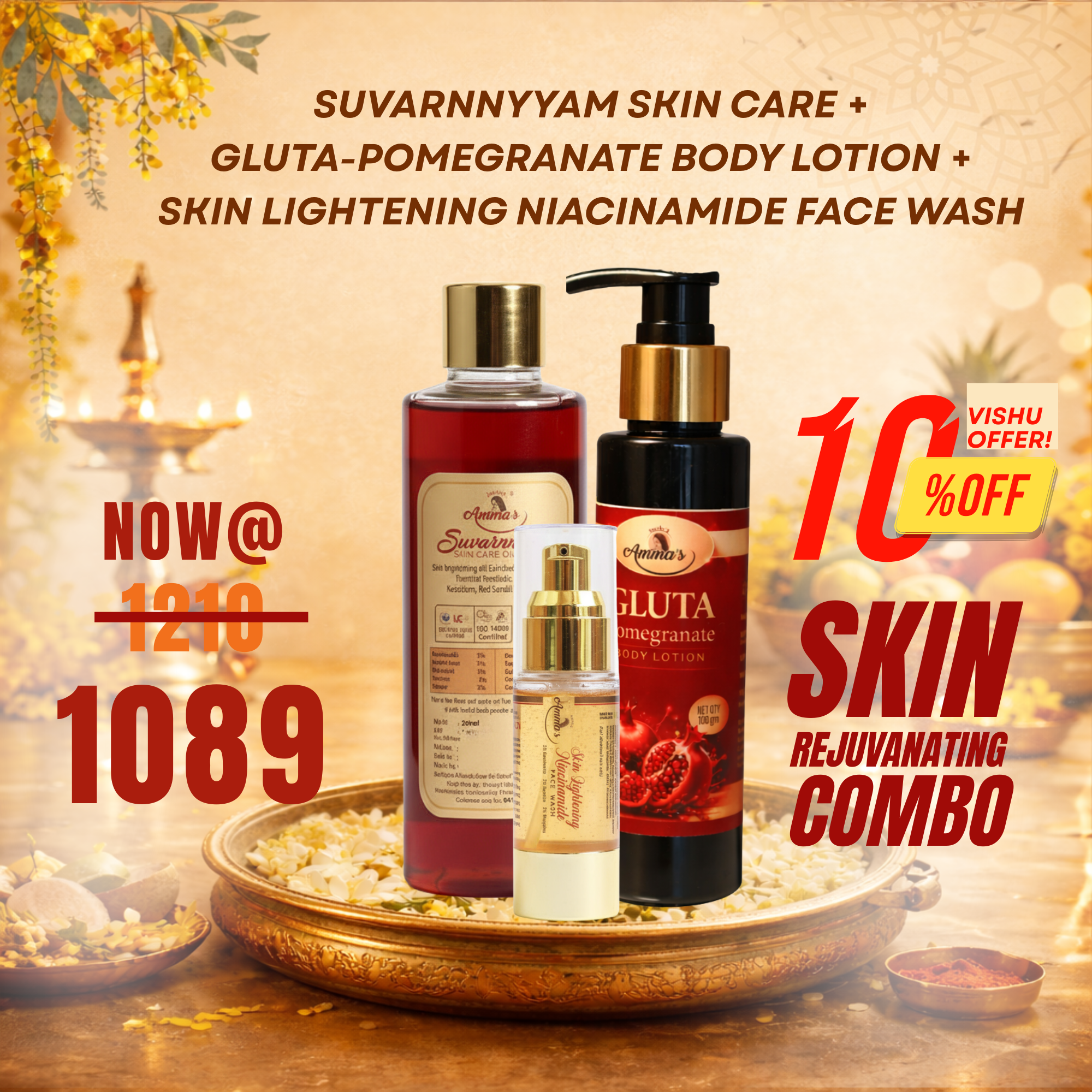 Revitalize your skin with the perfect blend of traditional Ayurvedic care and modern nourishment. The Suvarnnyyam Skin Care enhances natural radiance and evens skin tone, while the Gluta-Pomegranate Body Lotion deeply hydrates and improves skin texture for a soft, youthful glow.